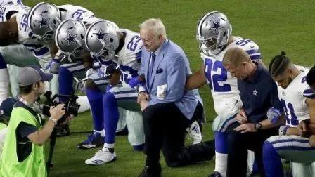 美国橄榄球届的风云人物,Dallas Cowboy队的老板Jerry Jones不同寻常地跟他的队员一起走进了绿茵场。在国歌响起之前,这位75岁的亿万富翁同队员手拉手一起跪在草地上。 全场嘘声一片。可是国歌响起时,他和队员们又一起站立来,全场又一片掌声。