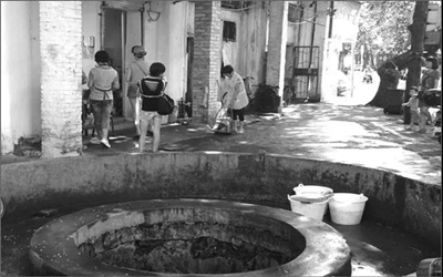连队有两个水井。一个主要是挑水喝的,一个是洗衣洗澡的。边上还有公共冲凉房,是给单身汉准备的。经常有水桶不慎吊到井里,有人会跳下去摸上来。家家户户用水都要扁担挑,大人用大胶桶,小孩用小胶桶。小学高年级的男孩,就要帮家里挑水了。