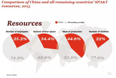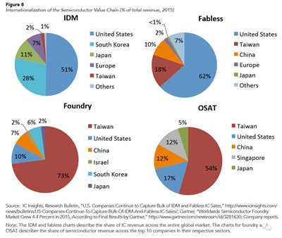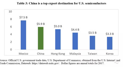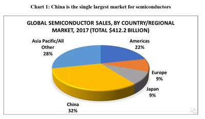如果说汽车全球价值链主要是在北美自由贸易区和美欧之间,那么半导体全球价值链中中国的分量则是举足轻重。中国是半导体产品全球最大的消费市场(市场规模占全球32%),是美国企业的主要出口和销售市场(出口额59亿美元,实现销售664亿美元),并逐渐开始在全球半导体设计、代工生产和测试封装等领域占据一席之地。