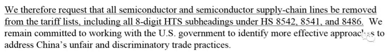 在向USTR提交的书面证词中,SIA的核心观点是:第一,加征关税无助于解决半导体产业关于产业政策、强制技术转让、知识产权盗窃等问题,更好的办法应当是维持全球半导体行业零关税的环境,同时加强打击知识产权侵权,并联合其他WTO成员共同诉诸WTO;第二,加征关税的主要成本将由美国半导体企业承担,而将低端封装产业转回美国将减损美国在高附加值领域的竞争力;第三,加征关税后,其他国家的半导体企业仍然会在中国从事组装测试封装,美国半导体企业竞争力将进一步削弱,全球销售份额也将受损。
