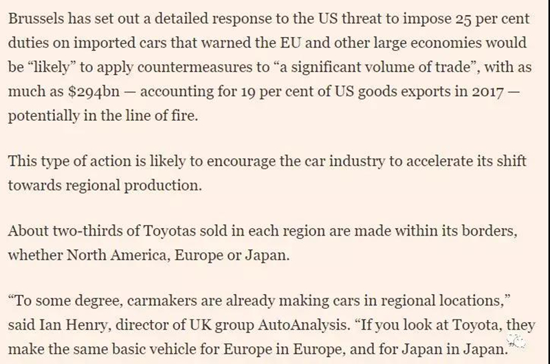20185月,美国宣布对进口汽车及零部件发起232国家安全调查。汽车贸易战的主战线有两条,一是美加墨三国的NAFTA谈判,美国要求提高NAFTA汽车区域价值含量门槛,要求墨西哥提高工人最低工资;二是美欧之间的谈判。2017年,美国汽车及零部件进口总额3348亿美元,第一大进口来源是NAFTA1583亿美元),第二大进口来源是欧盟(612亿美元);美国对这两个地区的出口分别是:对NAFTA出口916亿美元,对欧盟出口163亿美元。无怪乎欧盟可以在美国钢铁和铝制品232关税措施面前安之若素,但在汽车232关税措施面前则无法气定神闲了。