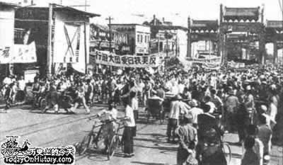 北平的反美扶日学生游行队伍行进在东四大街上