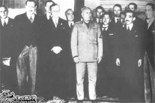 图为3国代表在罗马签字后合影。前排右起:意大利外长齐亚诺、日本大使崛田、墨索里尼、德国外长里宾特洛甫.