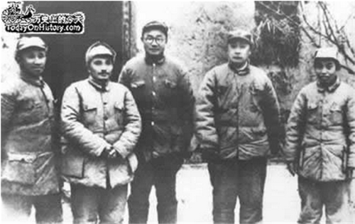 中共淮海战役总前委领导成员合影。左起:粟裕、邓小平、刘伯承、陈毅、谭震林
