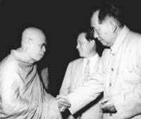 1958年6月30日,(Lssdjt.com)毛泽东主席接见胡达法师率领的柬埔寨佛教代表团。中国佛教协会副会长赵朴初(中)参加会见