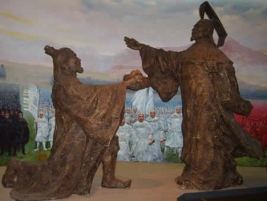 夫差与鲁哀公、晋定公,并排站在封禅台上,检阅三军,吴军精锐尽出,声势壮大,夫差所到之处,三军将士必齐声鼓噪。鲁、晋二公深畏服之。夫差志得意满。又与二公围猎,颇多斩获。二公赞曰:”真上马可治军,下马可治国之君也。“夫差听到他一生中对于自己最高的评价,顿时有飞升的感觉一般,腾云驾雾。两个月后,夫差帅大军回到吴国,姑苏城已空无一人。